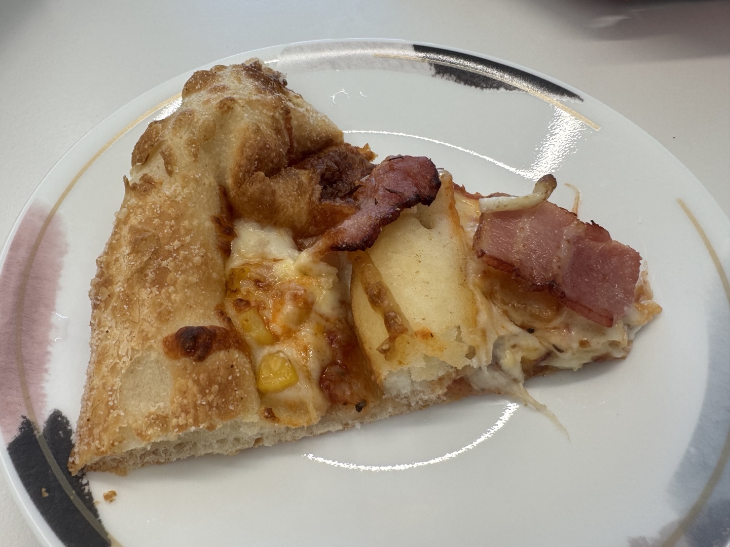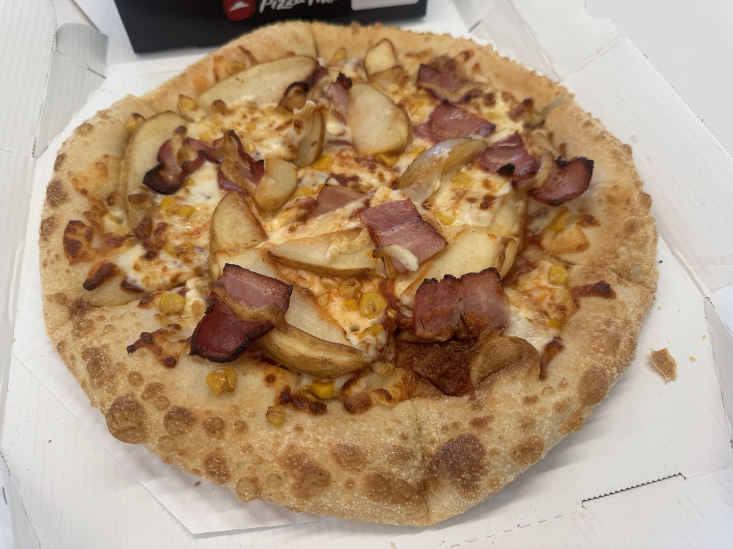 베이컨과 감자, 스위트콘이 토핑으로 올라가 있고 피자헛 특유의 쌀가루가 묻은 도우가 특징입니다.